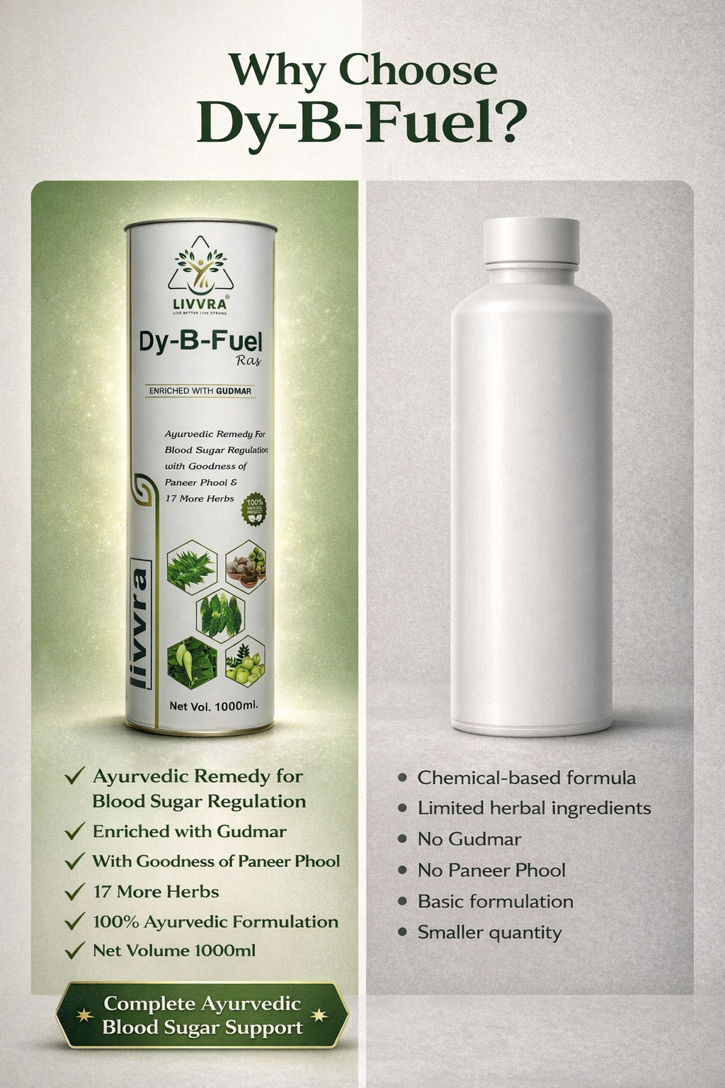 Livvra Dy-B-Fuel is a traditional Ayurvedic preparation. Natural variations in color and taste may occur. Consult a physician if you are on lifelong medication.