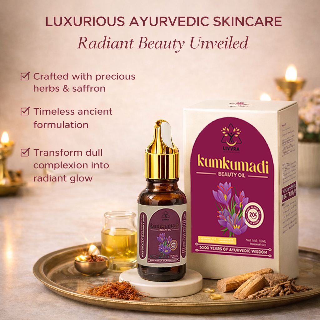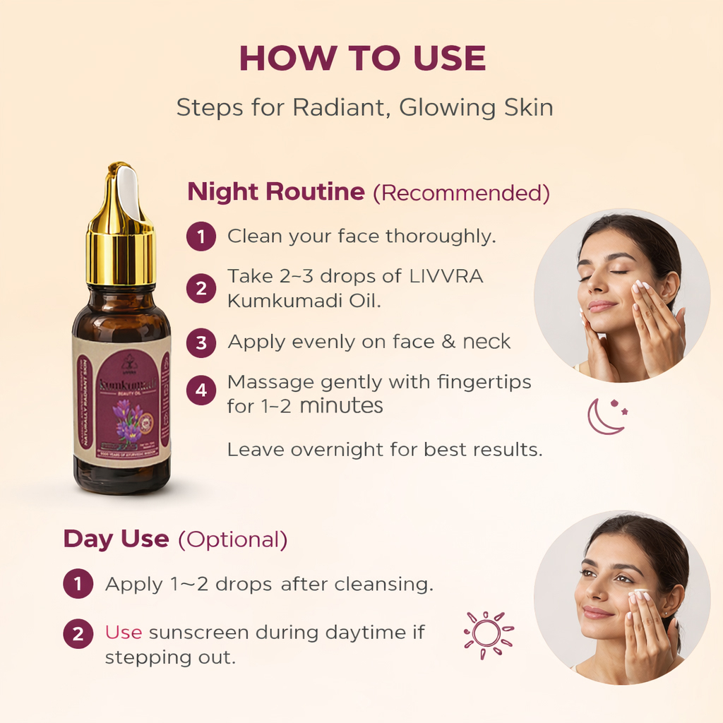 *LIVVRA Kumkumadi Beauty Oil is for external use only. Natural ingredients may vary in color or scent across batches. Store in a cool, dry place away from direct sunlight.