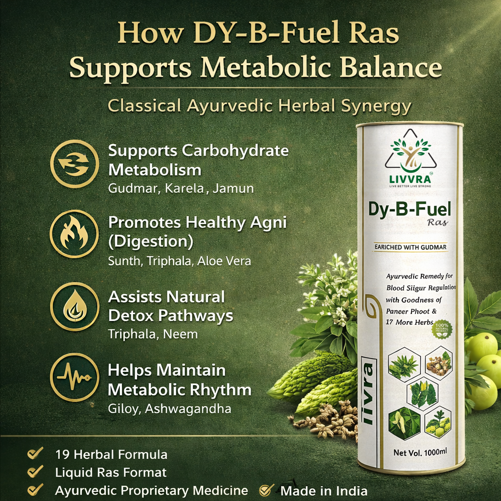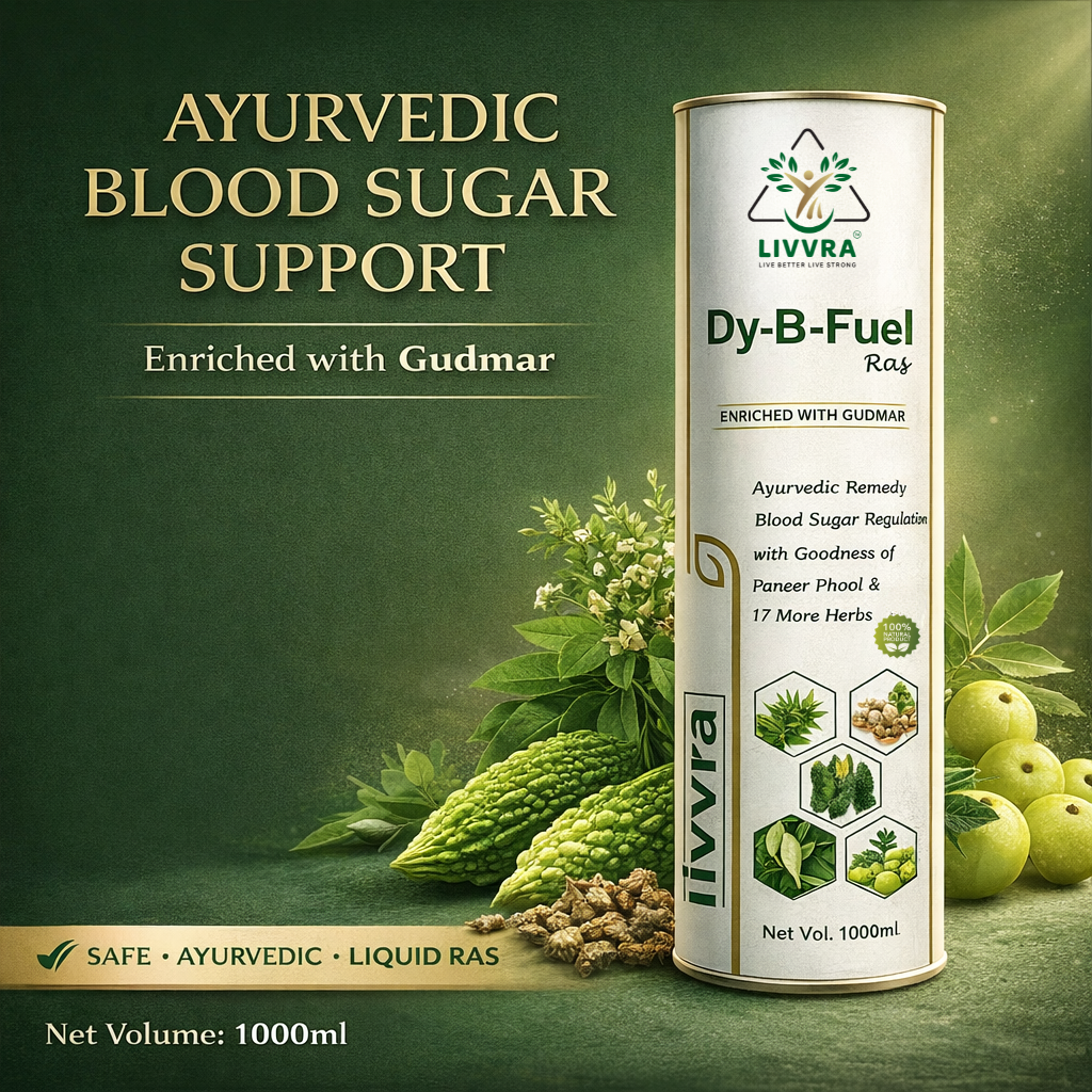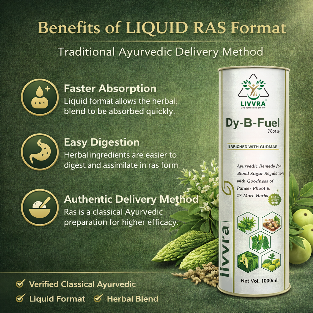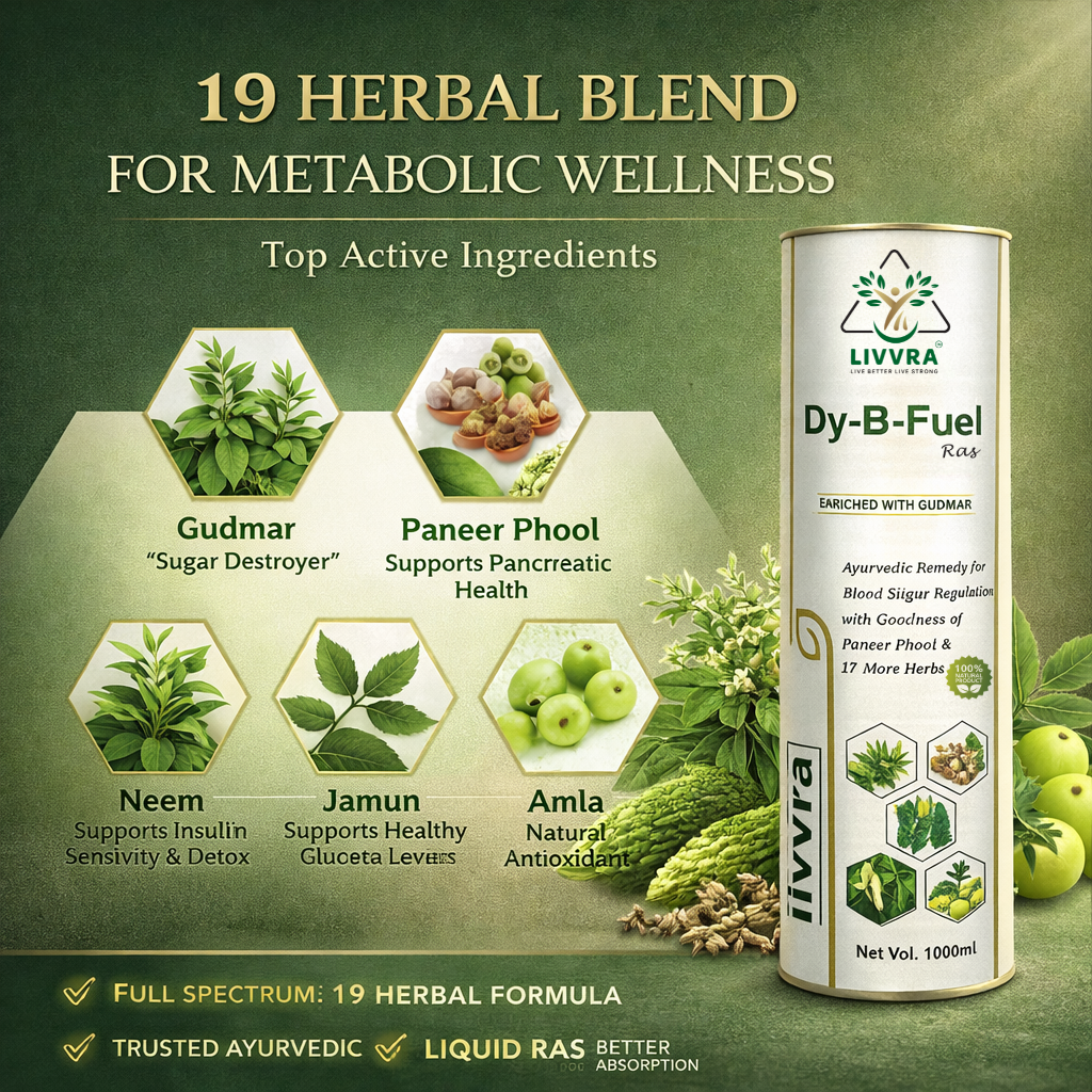 ๐ฟ A scientifically formulated Ayurvedic proprietary liquid designed to support healthy blood sugar regulation and metabolic balance. LIVVRA DY-B-Fuel-Ras combines Gudmar, Paneer Phool, and 17 additional herbs in a traditional liquid ras format for enhanced absorption and digestive support. โ 19 Herbal Ingredients โ Liquid Ras for Better Absorption โ GMP Manufactured โ 100% Natural Herbal Blend